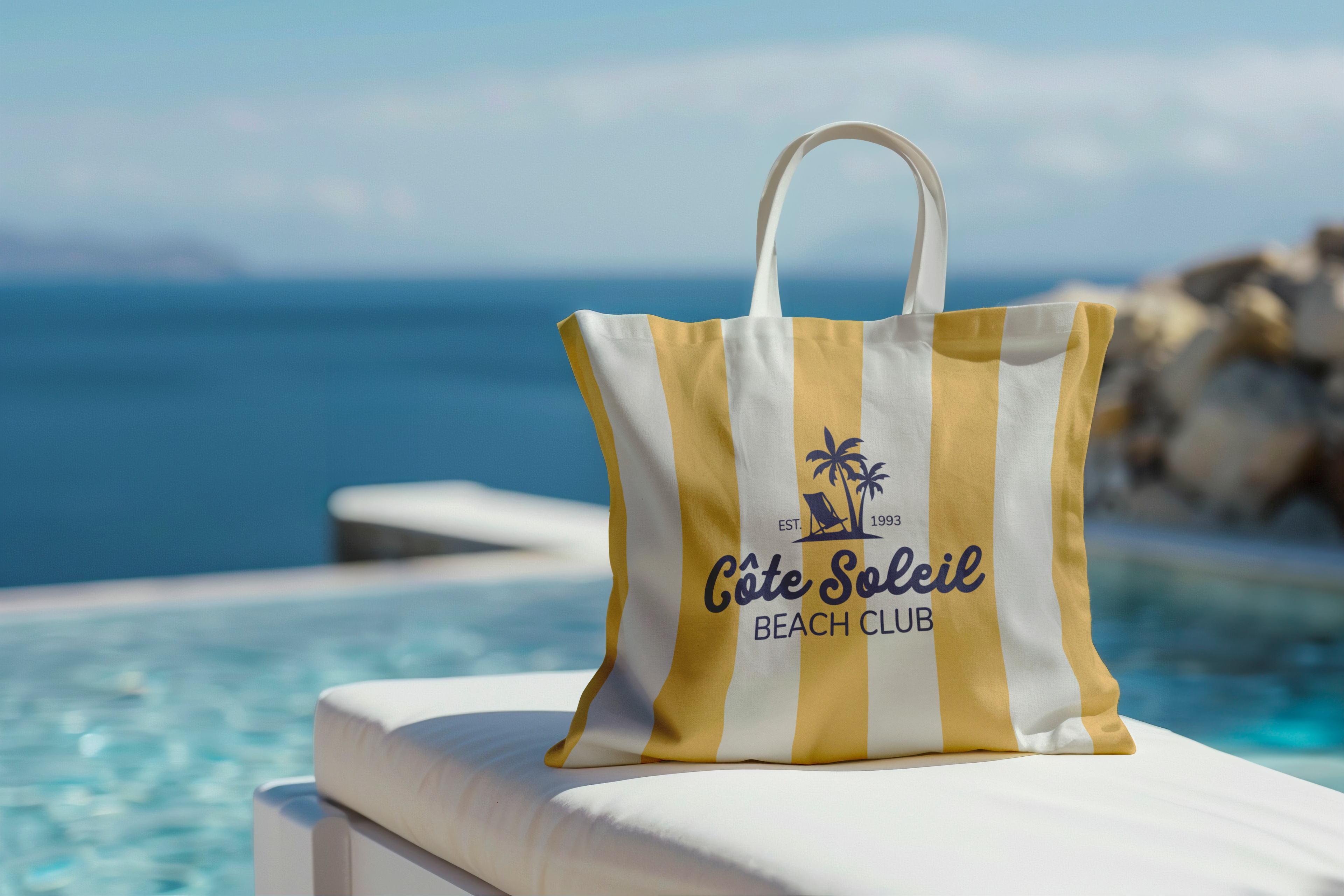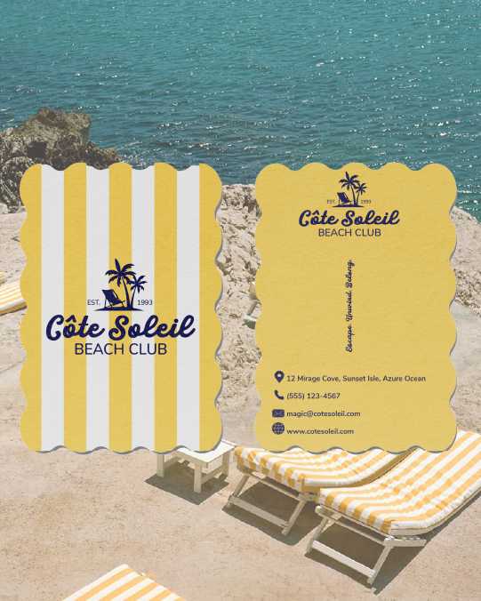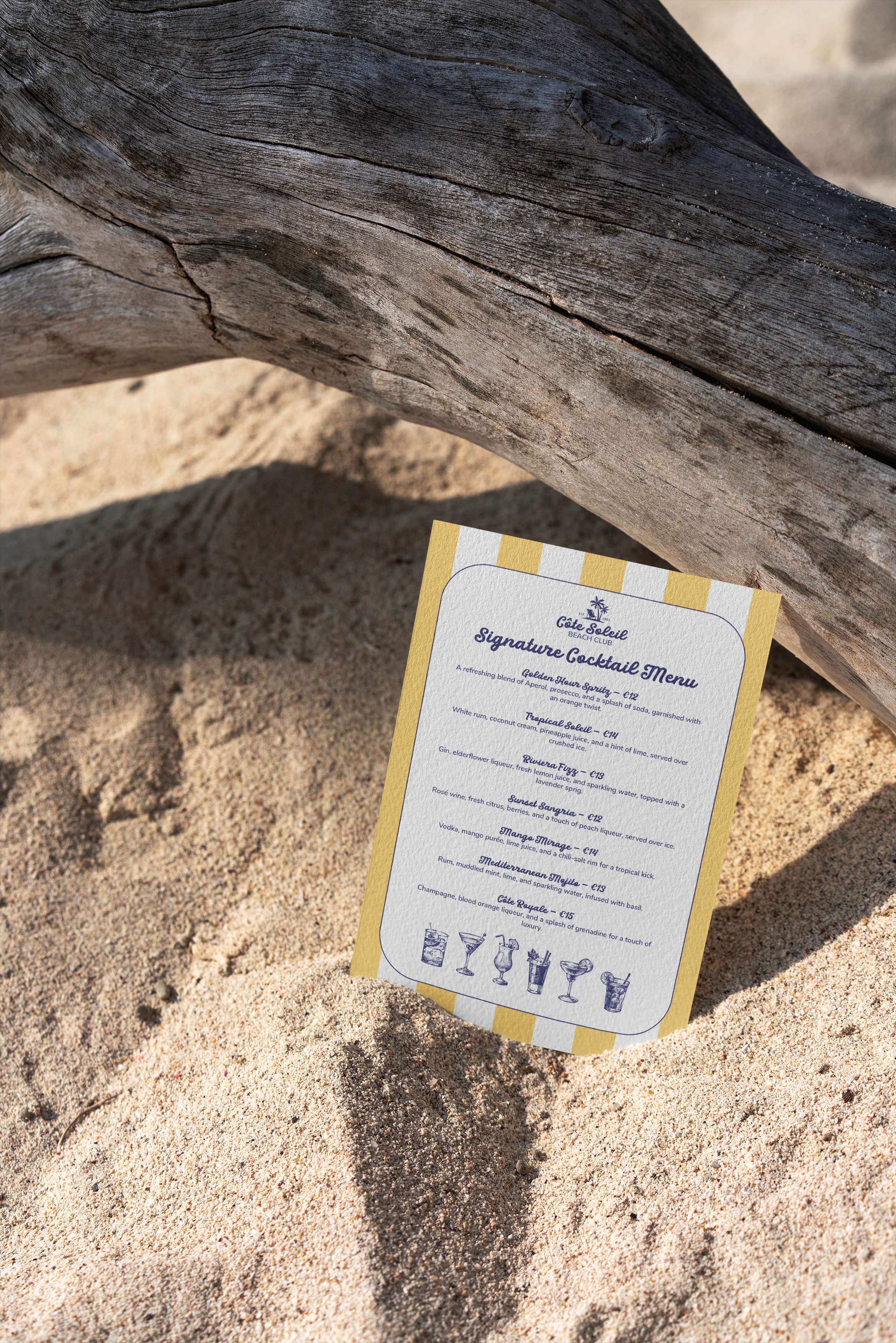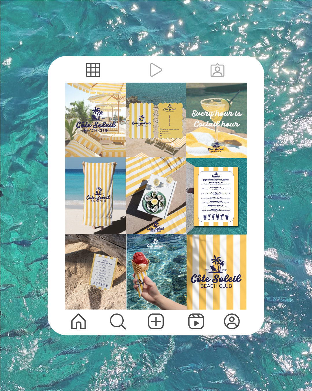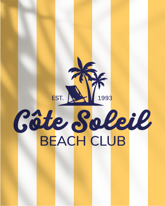 Eine zeitlose, elegante Markenidentität, die Luxus und Leichtigkeit des Strandlebens vereint. Gelb-weiße Streifen symbolisieren Sonne und Sommer, während das tiefe Blau Beständigkeit und Exklusivität vermittelt. Das Ergebnis ist ein harmonisches, luxuriöses Erscheinungsbild, das sich konsequent in Print, Social Media und Merchandise widerspiegelt.