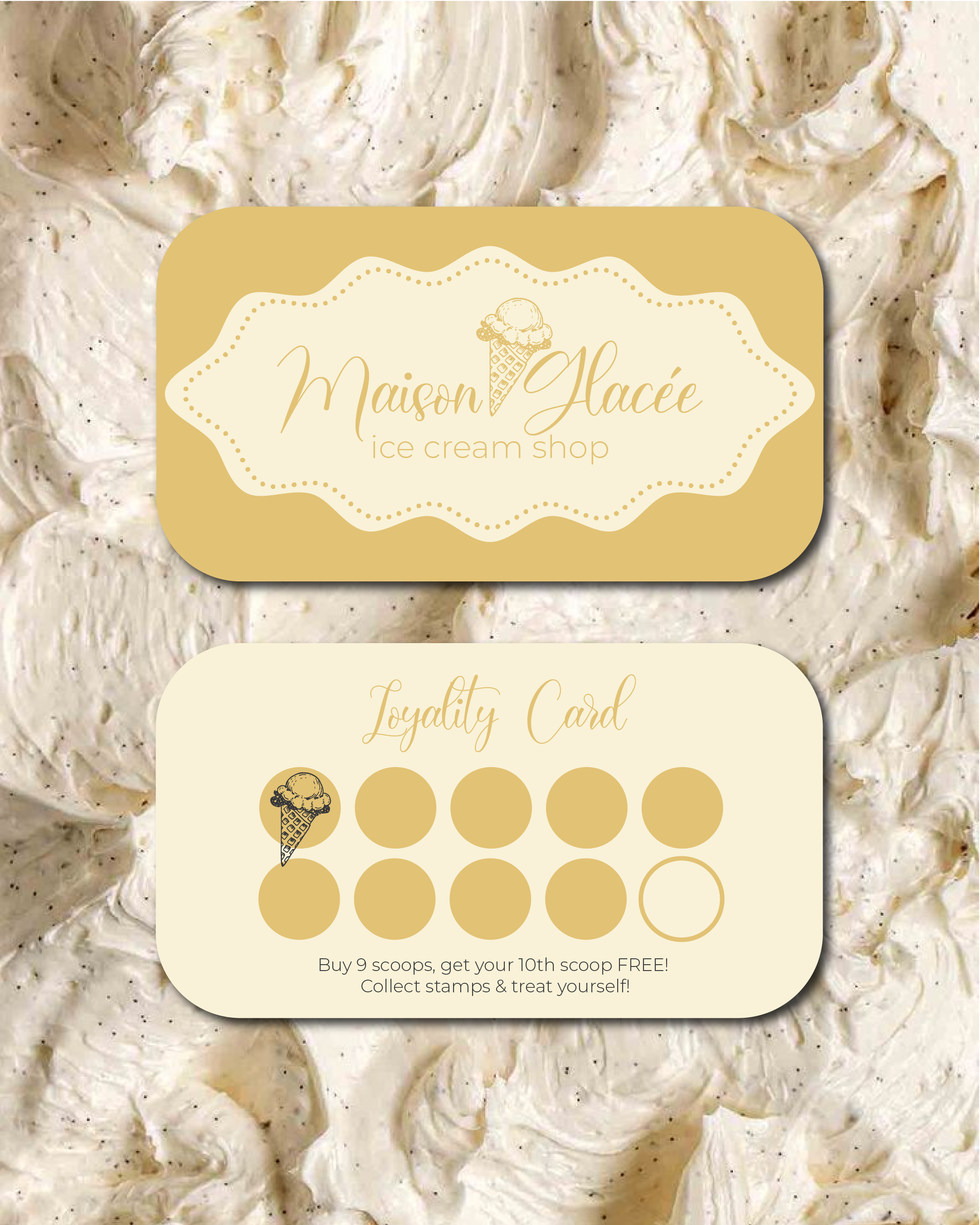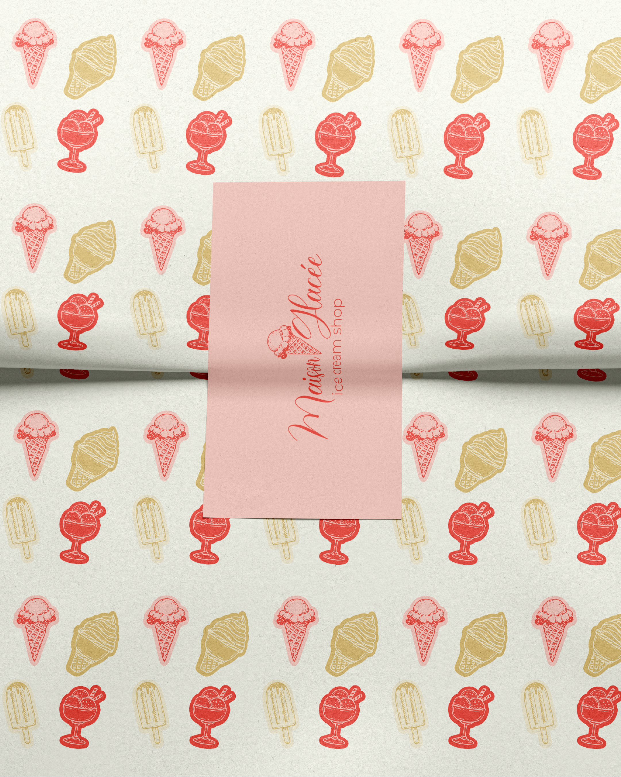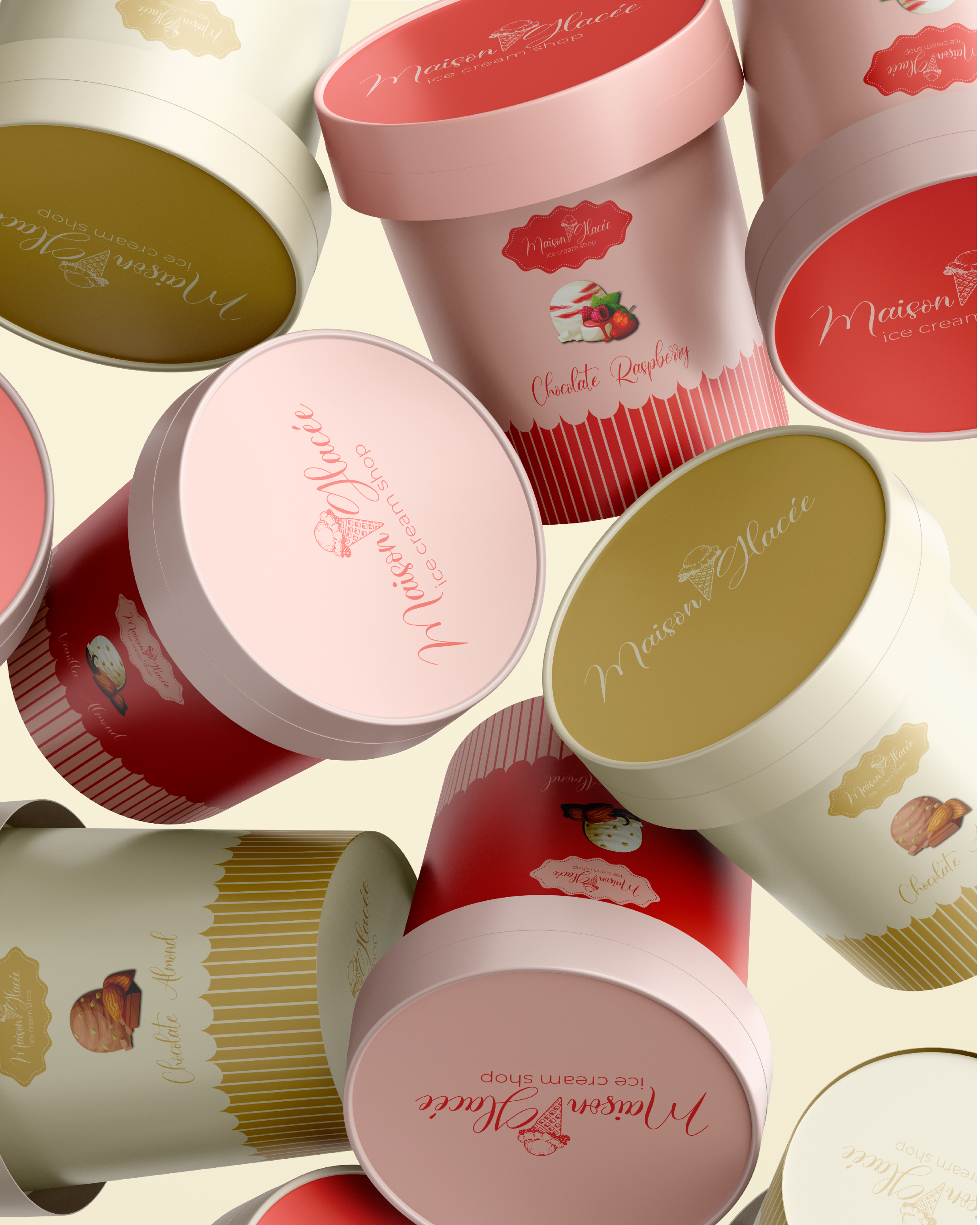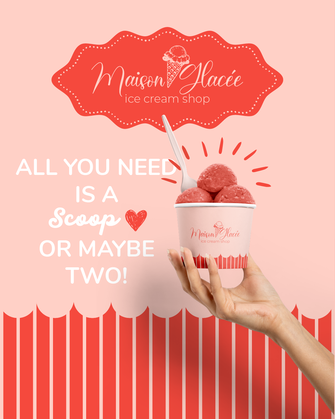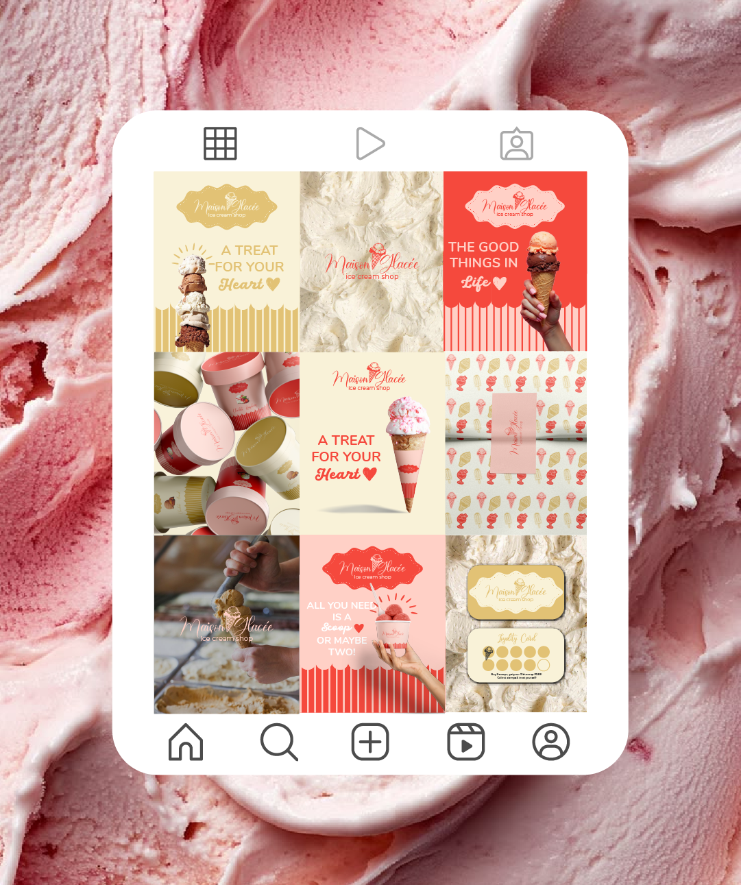 Ein verspieltes und charmantes Design, das die Freude am Eisgenuss hervorruft. Pastellfarben, liebevolle Illustrationen und elegante Details schaffen eine warme, einladende Atmosphäre. Das Erscheinungsbild vereint Nostalgie und Modernität und sorgt für ein unverwechselbares Kundenerlebnis von der Verpackung bis zum Social Media.