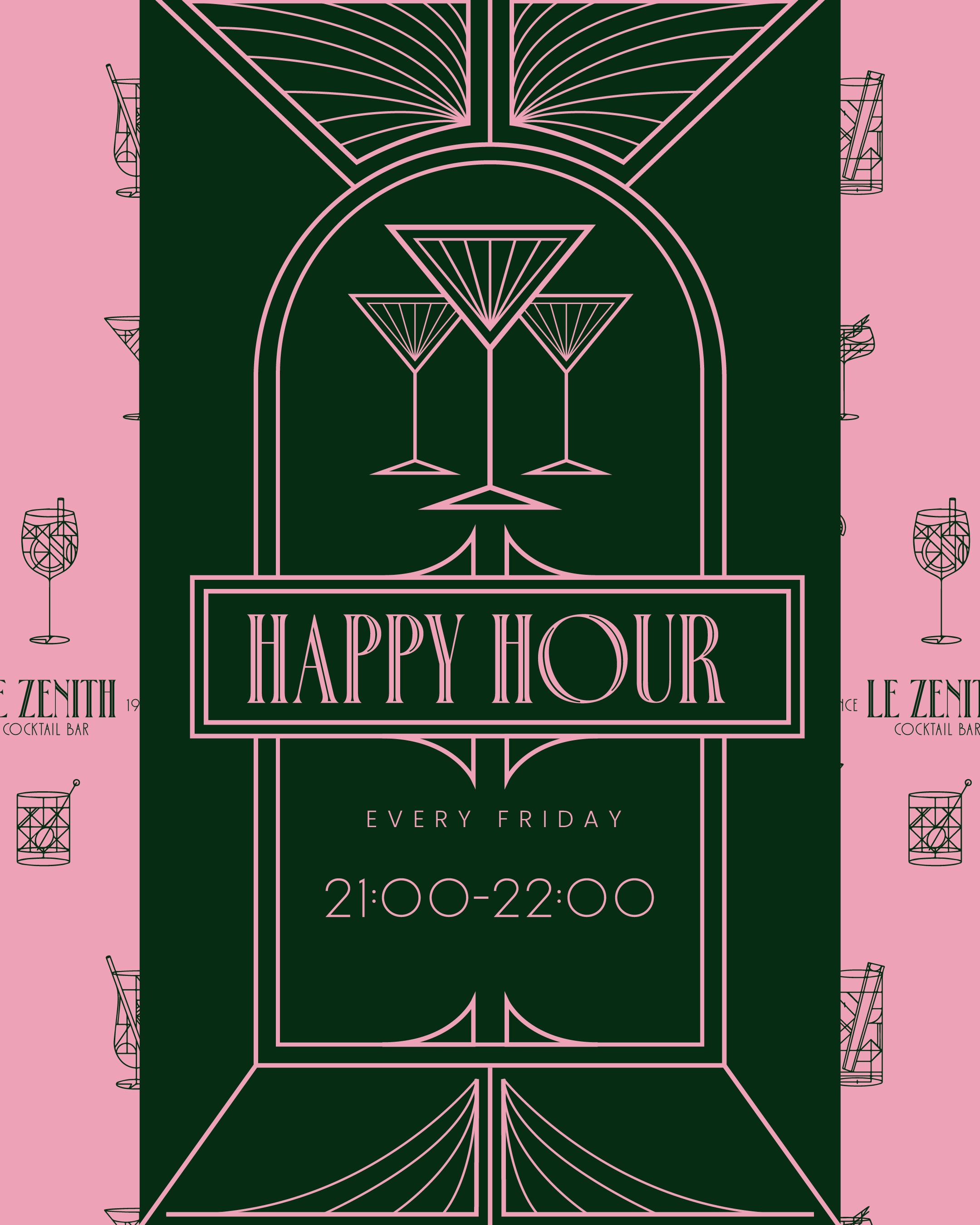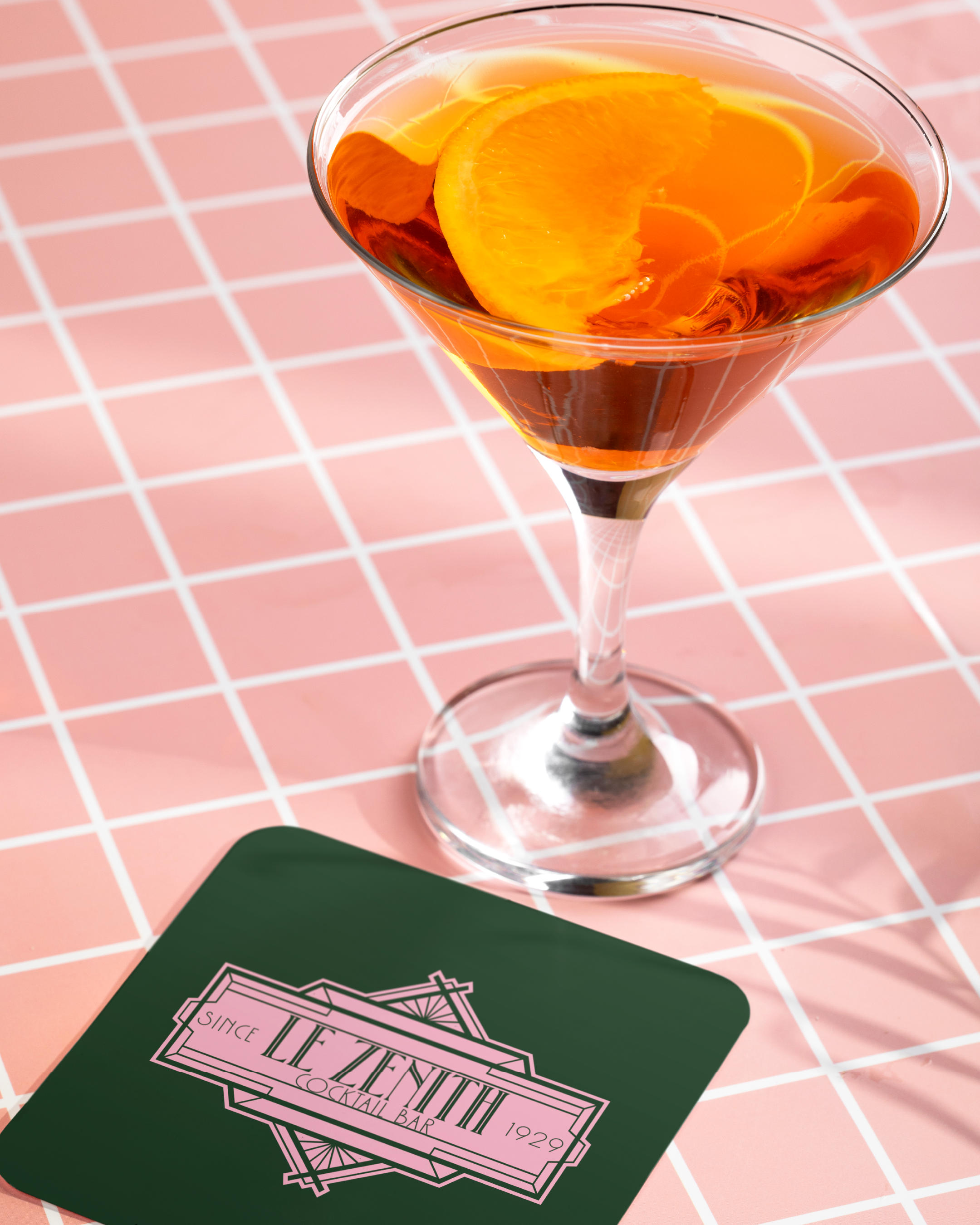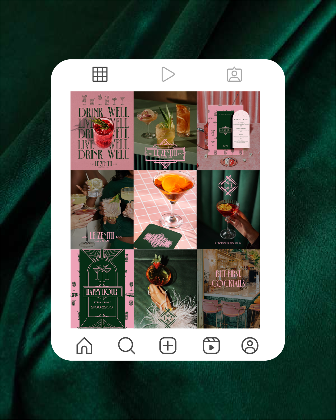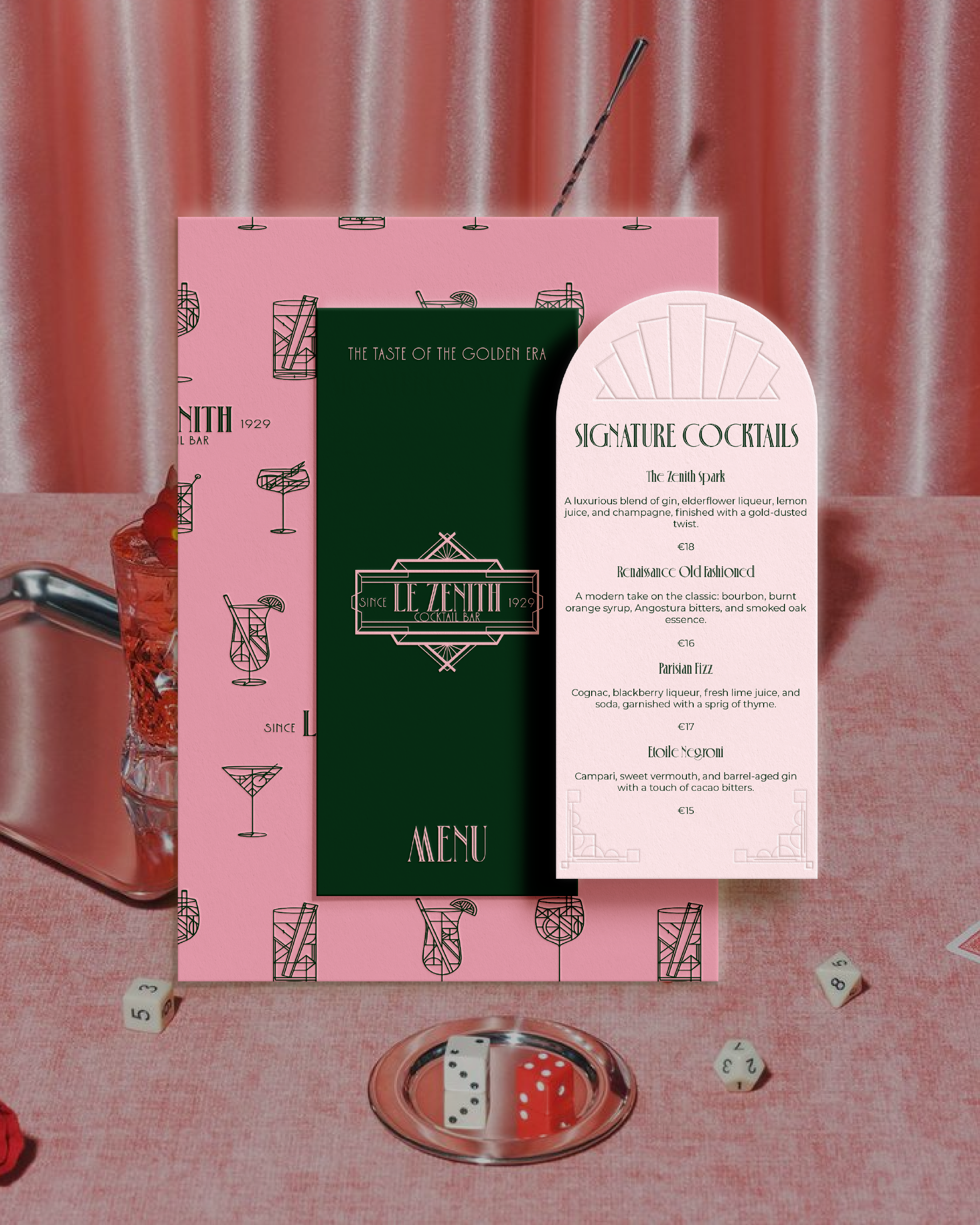 Ein Art-Deco inspiriertes Design, das an die glamouröse Atmosphäre der 1920er Jahre erinnert. Dunkelgrün, Rosé und geometrische Formen erzeugen Eleganz und Extravaganz. Das Branding schafft ein stilvolles, starkes Gesamtbild, das die Exklusivität der Bar in jedem Detail unterstreicht.